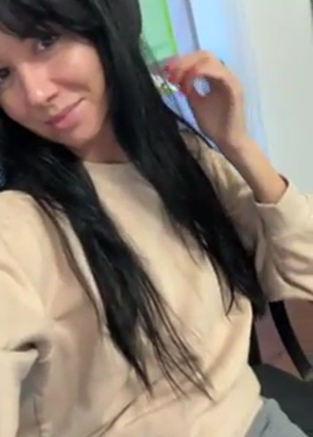 A woman with long black hair, bangs, and red nails sits in a black office chair wearing a beige sweatshirt and grey sweatpants