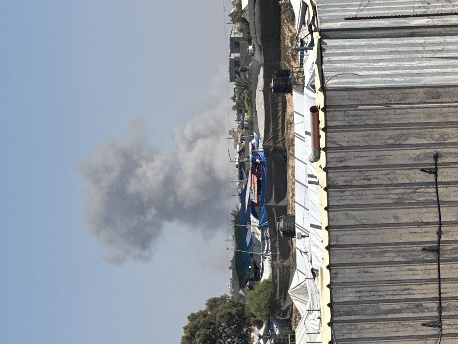 A prominent column of dense, dark gray smoke ascends into a clear blue sky above a densely populated area in Al-Mawasi. The smoke, indicative of an explosion or fire, rises vertically before expanding into a mushroom-like cloud at its apex. Below the smoke, a sprawling settlement or camp is visible, characterized by numerous makeshift structures, including tents and shelters, covered primarily with various colored tarpaulins in shades of blue, green, black, and white. Several black cylindrical water tanks are interspersed among these structures. Sparse green foliage and a few trees are also present within the settlement. In the mid-distance, behind the immediate settlement, some grey, permanent-looking concrete buildings are discernible. The immediate foreground is dominated by the upper section of a vertical corrugated galvanized metal structure or wall, exhibiting vertical striations and weathering. On a flat, light-colored roof immediately behind this wall, a segment of a reddish-brown pipe rests horizontally. No individuals are visible within the frame.