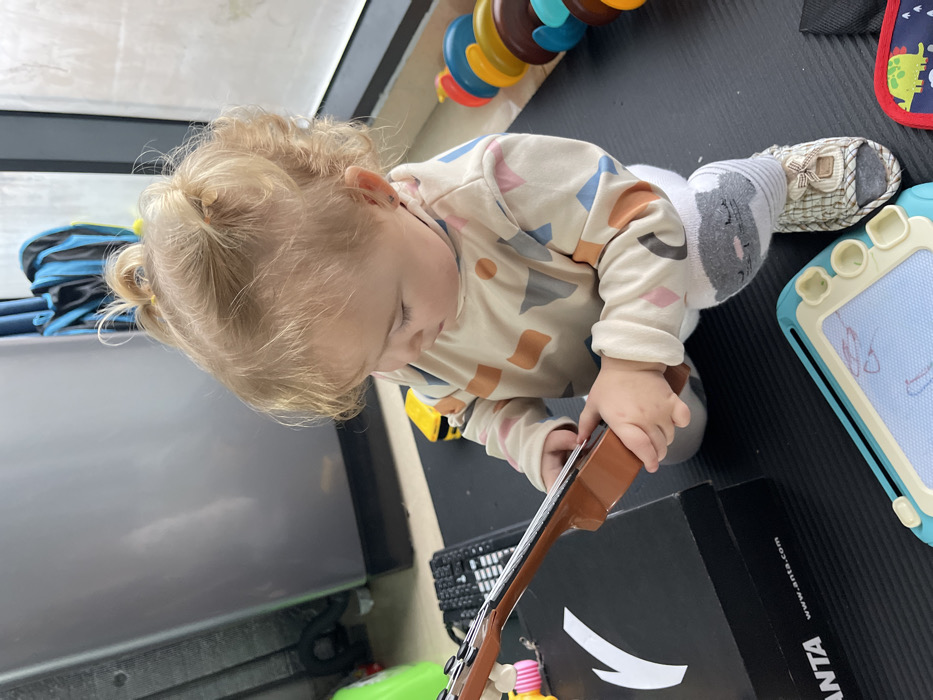 In an indoor setting within Jinshui District, China, a toddler with light-colored curly hair, tied in two small ponytails, kneels on a dark mat. The child wears a long-sleeved light-colored shirt with abstract geometric patterns, grey-and-white patterned pants featuring cat faces on the knees, and one visible light-colored shoe with a decorative bow. A small stud earring is present in the child's left ear. The child holds a brown toy guitar, looking down at its strings and neck intently. To the child's immediate left is a black box labeled "ANTA" with a white checkmark logo and website. Further left, a black keyboard-like object is partially visible. In front of the child, a light blue and white magnetic drawing board displays a red drawing. To the child's right, a yellow toy car and a multi-colored stacking toy are present. The background features a large silver appliance, possibly a refrigerator, on the left, and a dark and light blue backpack hanging near a window on the right, through which ambient light enters.