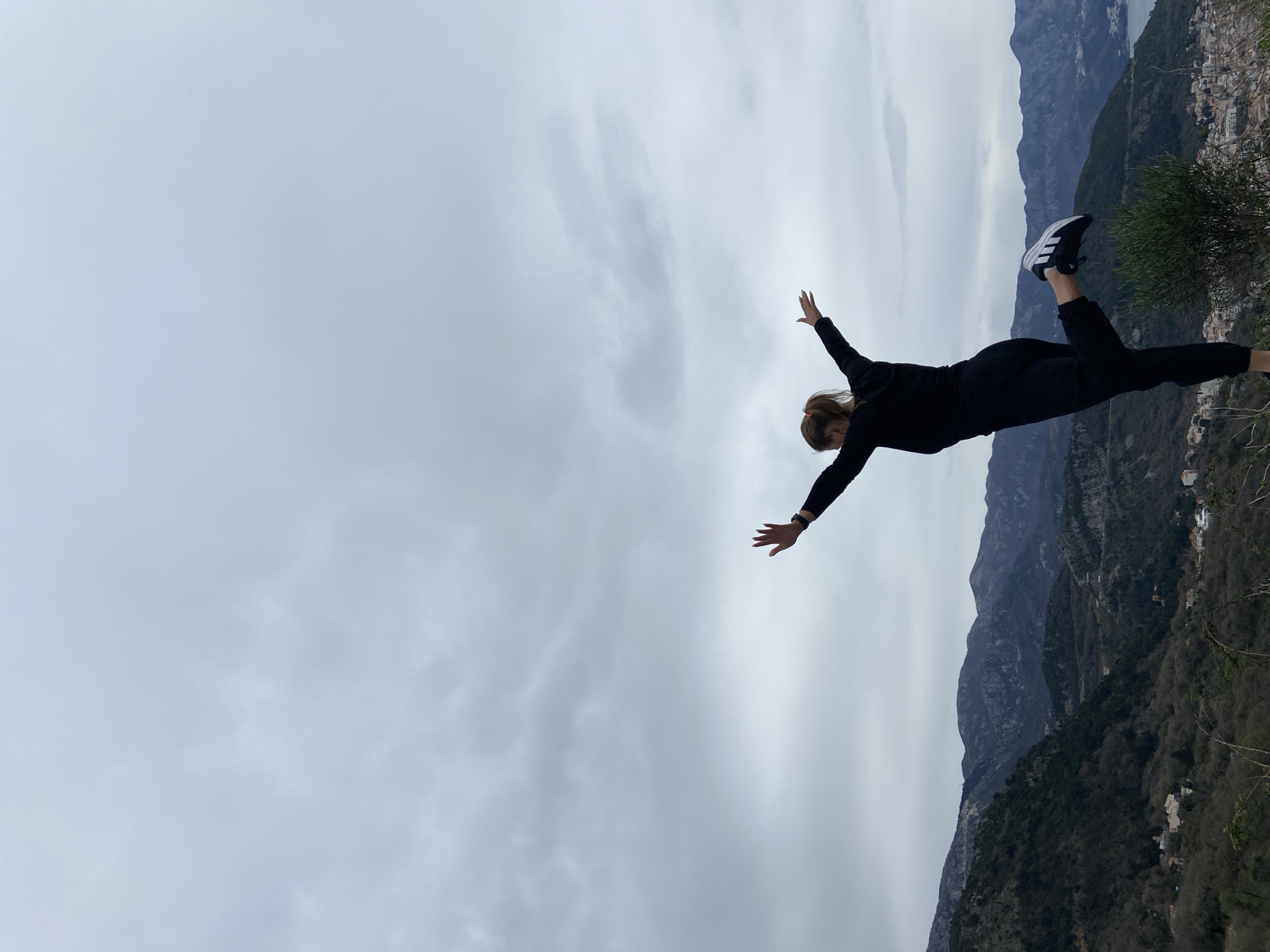 woman standing on a ledge with her arms outstretched, seemingly balanced on the edge of a mountainous landscape. She is wearing black athletic attire, including a jacket, pants, and sneakers with white stripes. The backdrop consists of a cloudy sky and a view of mountains, vegetation, and possibly buildings that would place the location as Podostrog, Montenegro.