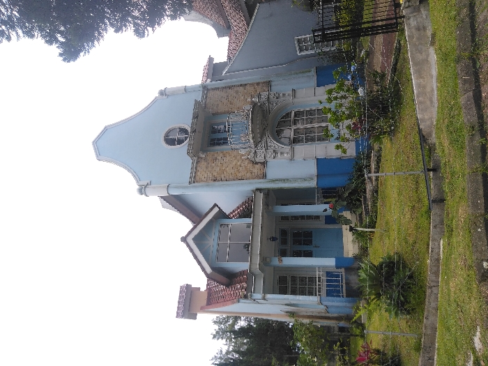 - "The image displays a multi-story residential building with a light blue and dark blue painted facade, reddish-brown tiled roofs, and beige brickwork, under an overcast sky" by FM-U14g83, licensed under CC BY 4.0