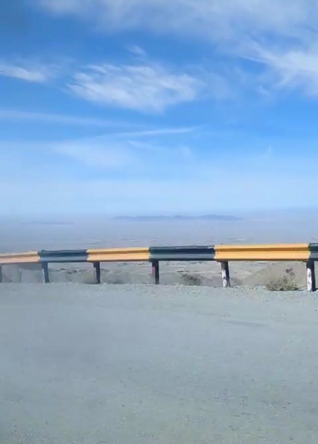 The video presents a wide, expansive landscape view from what seems to be a roadside or a paved area. A safety barrier, painted in alternating sections of yellow and black, runs along the edge. Beyond the barrier, a vast plain stretches out, partially obscured by a light haze. The distant horizon reveals subtle undulations suggesting the presence of hills or mountains, appearing somewhat muted due to the atmospheric perspective. The sky is a clear blue, sparsely decorated with thin, wispy clouds that add depth to the scene. As the video progresses, the landscape opens up to a broader view, revealing the undulating terrain more distinctly. The immediate ground surface around the paved area is coarse, possibly gravel or a rough aggregate, with sparse vegetation visible in some areas. The general impression is one of open space and a distant horizon.