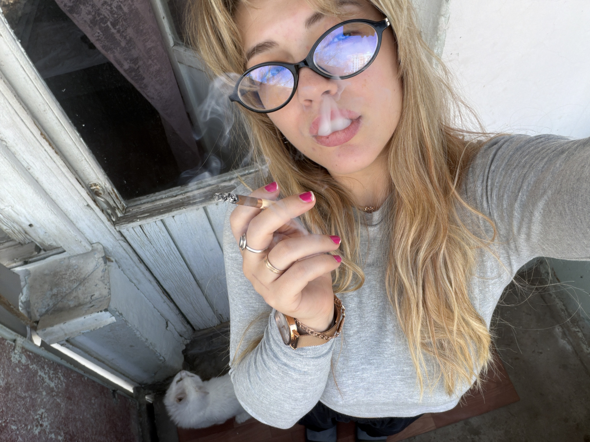An adult female, with light-colored hair and wearing black-framed oval glasses, is depicted in a close-up, selfie-style image. She is wearing a grey long-sleeved top, a rose gold-toned watch on her left wrist, and multiple rings on her left hand, which has fuchsia-painted fingernails. She is holding a lit cigarette between her left index and middle fingers and is actively exhaling smoke from her parted lips. Reflections in her glasses show urban architectural elements and a blue sky, indicating an outdoor or brightly lit setting. Positioned on the ground below and to the left of the female subject, a small white domestic rabbit is partially visible. The background consists of weathered wooden structures, painted white with noticeable peeling paint, on the left side. An opening in this structure reveals a dark interior, partially obscured by a dark, patterned curtain. The ground directly beneath the subjects is a combination of brown wooden planks and a darker, possibly concrete or tiled section. A light-colored, textured wall is visible to the right. The scene is located in Naberezhnye Chelny, Russia.