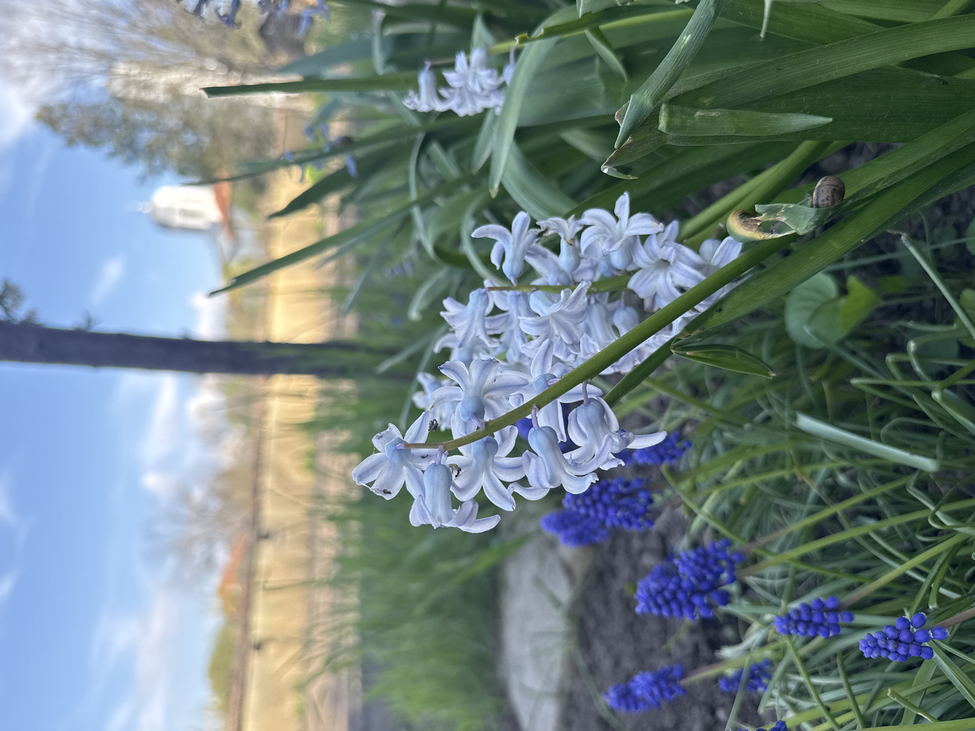 close-up of light blue hyacinth flowers with a few grape hyacinths in the foreground, set against a background containing greenery and an out-of-focus view of buildings, a blue sky with clouds, and a bare tree branch. A snail is present on one of the green leaves in the middle ground. The location is Polikraishte, Bulgaria.