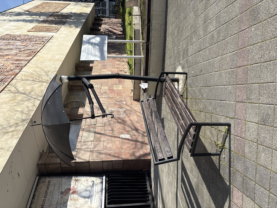 The image displays an outdoor urban scene in Pazardzhik, Bulgaria, under bright daylight. The central focus is an unoccupied art installation consisting of a dark wooden slatted park bench with a black metal frame, integrated with a black metal lamppost. The lamppost features two pipe-like arms that hold a large, open black metal umbrella directly over the bench. The ground consists of grey concrete paving stones, with a distinct horizontal stripe of reddish pavers visible in the foreground. Sparse vegetation, including moss and weeds, is present in the cracks between the pavers, particularly around the base of the bench. In the background, a multi-story building with a two-tone facade is visible. The upper section is light-colored and features several recessed rectangular panels with intricate, possibly bas-relief, artwork. The lower section of the building is constructed from reddish-brown brick or stone. On the left side of the lower facade, a large white poster advertises an exhibition, displaying Bulgarian text, including "ШУМЕН," and an illustration of a person with a large fish. To the right, a white information sign on two posts stands within a raised planter bed containing green grass. Strong shadows from the lamppost, umbrella, and unseen trees are cast upon the building facade and the paved ground, indicating clear weather. No individuals are present in the scene.