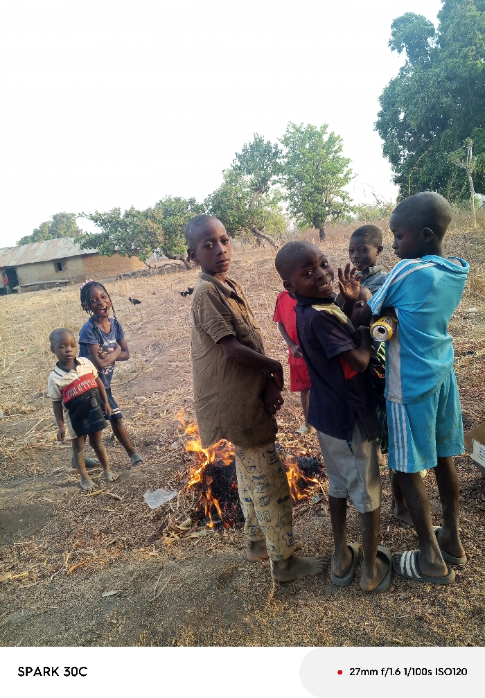 The image captures an outdoor scene in Lafia, Nigeria, featuring six children gathered on dry, dusty ground under a bright, hazy sky