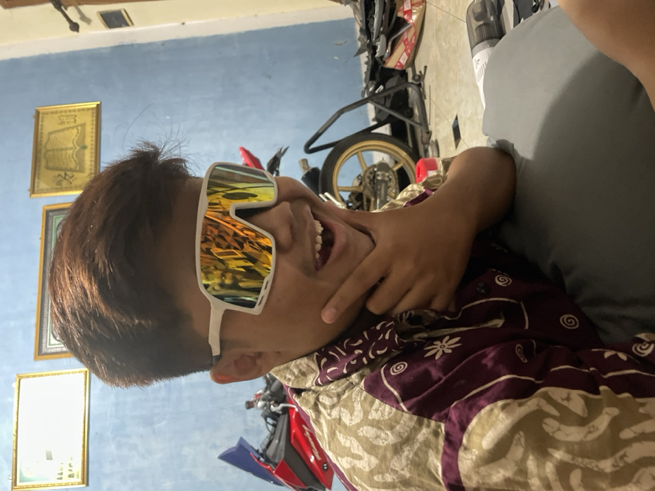 A young male individual, appearing to be of Indonesian ethnicity, is prominently featured from the mid-torso upwards, positioned on the right side of the frame and facing slightly left. He has short, dark brown hair and is wearing white-framed, highly reflective iridescent sunglasses, obscuring his eyes. His mouth is open in a smile, revealing teeth, and his right hand is placed under his chin. He is dressed in a short-sleeved collared shirt with a dual pattern: light brown with irregular wavy designs on the left and dark maroon with white circular and floral motifs on the right. He appears to be reclining on a grey surface. The background consists of a light blue textured wall. Three framed pictures are affixed to the wall: one horizontal white frame to the left, and two vertical gold frames, one depicting text or a design and the other an open book with Arabic script. To the immediate left of the individual, a red and black motorcycle with a blue fairing is partially visible. Behind the individual, a black motorcycle stand is present, along with the gold-colored spoked wheel of another motorcycle. Various indeterminate objects and a cardboard box are situated on the floor to the far right. The scene is an indoor setting, likely a garage or multi-purpose room, located in Margorejo, Indonesia.