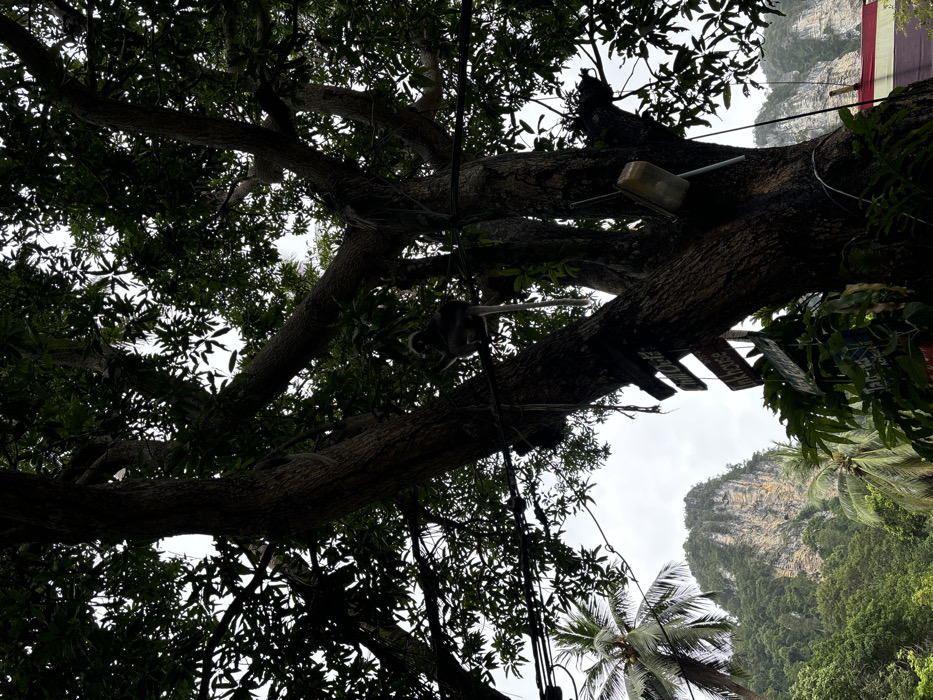 This image depicts a Dusky Leaf Monkey (Spectacled Langur) seated in a large tree in Ban Ao Nang, Thailand