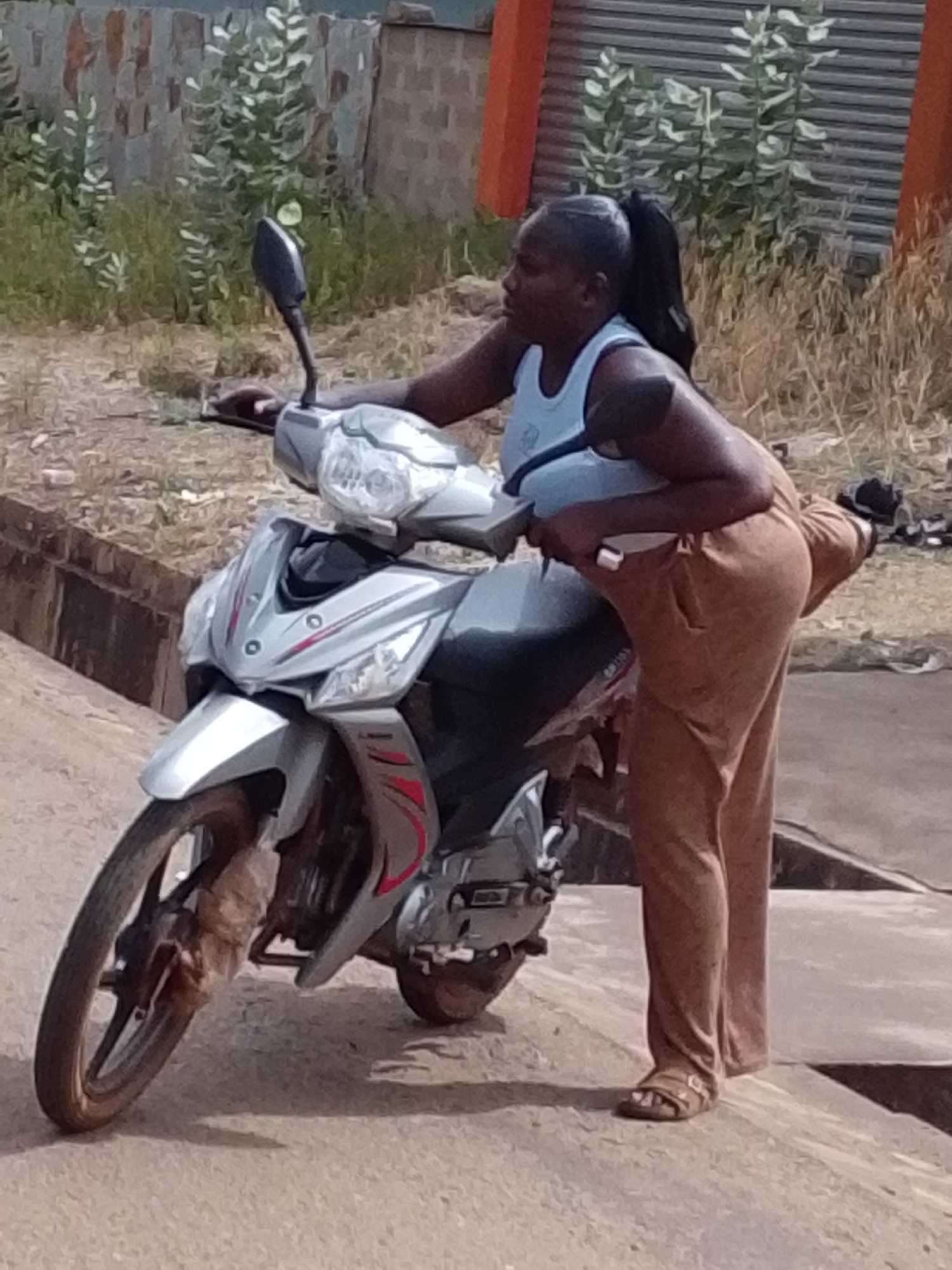 woman standing next to a silver Yamaha motorcycle on a paved surface. The woman is wearing a light blue tank top and brown pants. She has a ponytail. The motorcycle is parked near a concrete curb. The background includes some greenery, a wall, and an orange structure. The location is in an urban area, specifically Tamale, Ghana.