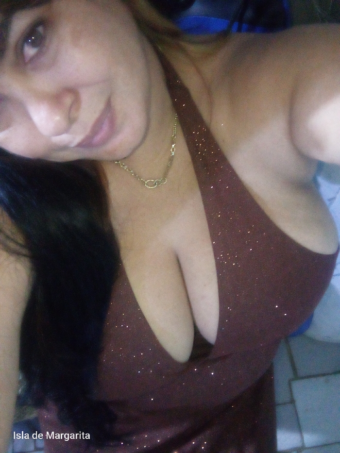 A fair-skinned female is depicted in a close-up, angled selfie. She has dark hair, partially visible on the left side of the frame, and brown eyes, looking towards the camera with a slight smile. She wears a dark reddish-brown (maroon) halter-neck dress with visible glitter accents. A simple gold-colored chain necklace with an intertwined loop design is worn around her neck. The dress style accentuates her prominent cleavage. The background is blurred, showing a blue object behind her right shoulder and light-colored tiled flooring in the lower right, suggesting an indoor setting. Text in the lower left corner reads "Isla de Margarita". The implied location is Juan Griego, Isla Margarita, Venezuela.