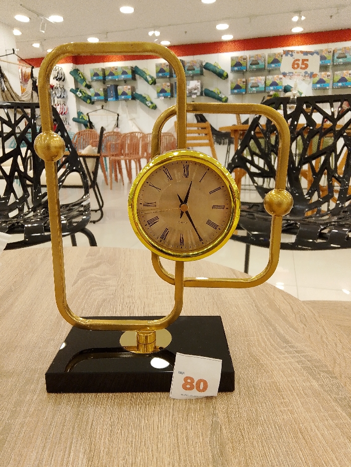 A gold clock with Roman numerals sits on a black square base with a price tag of "80"