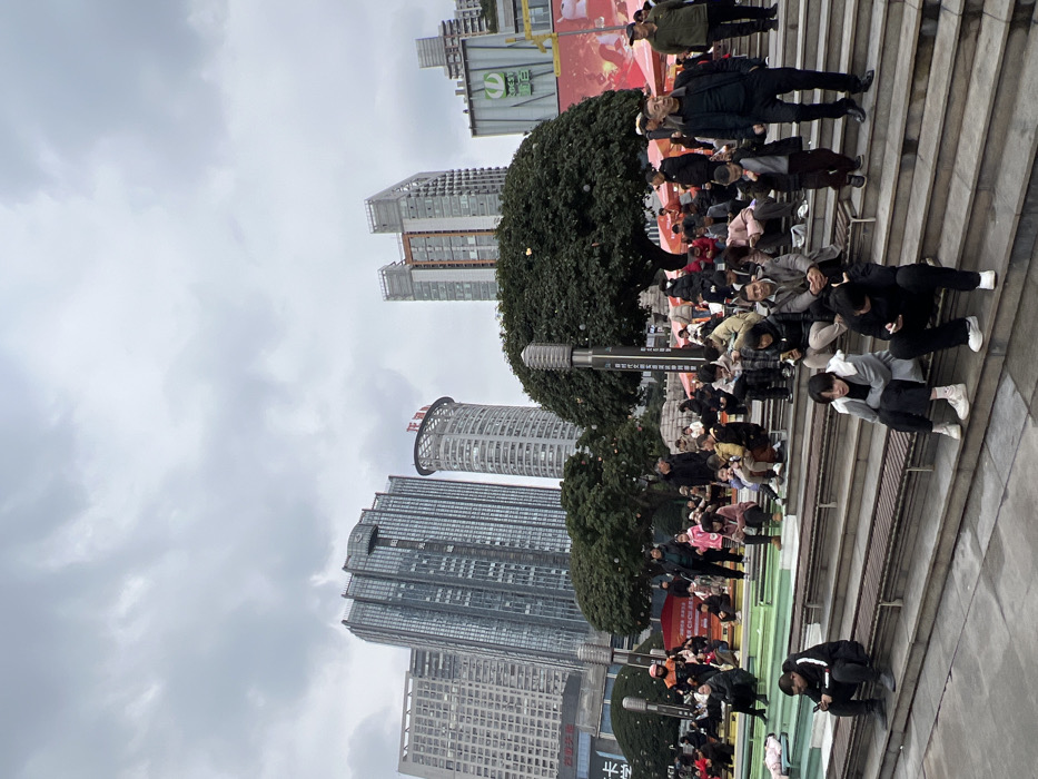 A bustling city scene unfolds beneath a cloudy sky, showcasing tall buildings in the background. A group of people are gathered on steps, many positioned as if taking pictures or looking at something on the ground. Some people are standing while others squat. Lush trees frame the scene, and a sign is visible, suggesting a public gathering place. The overall impression is a crowded urban setting.