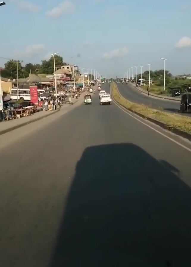 street scene with light traffic. The camera is moving forward on a paved road with a roadside marketplace on the left and a green area on the right. There are light poles lining the road. Vehicles including cars, tuk-tuks, and motorcycles are present. People are visible in the marketplace area and walking along the side of the road. The sky is blue with some clouds. The shadow of the recording vehicle is visible in the foreground.