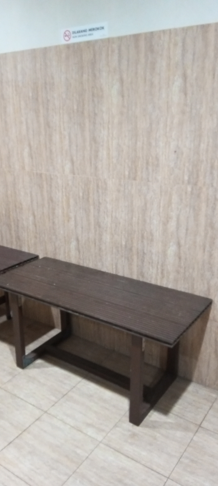 The image depicts an interior space within Pacet, Indonesia, likely a waiting area or common room. The background features a two-toned wall: the upper section is plain white, and the lower section is covered with light brown, vertically-grained paneling or wallpaper. A white rectangular sign with a red "no smoking" symbol and the text "DILARANG MEROKOK" (Indonesian for "NO SMOKING") and "NO SMOKING AREA" is affixed to the upper white wall. In the midground, two dark brown wooden benches are visible. The primary bench, positioned horizontally, is a long, rectangular structure with a slatted top and sturdy square-profile legs. A portion of a second, identical bench is partially visible to the left. The floor is covered with light-toned, square ceramic tiles arranged in a grid pattern. The space is unoccupied by any individuals. Illumination appears even, suggesting artificial lighting.