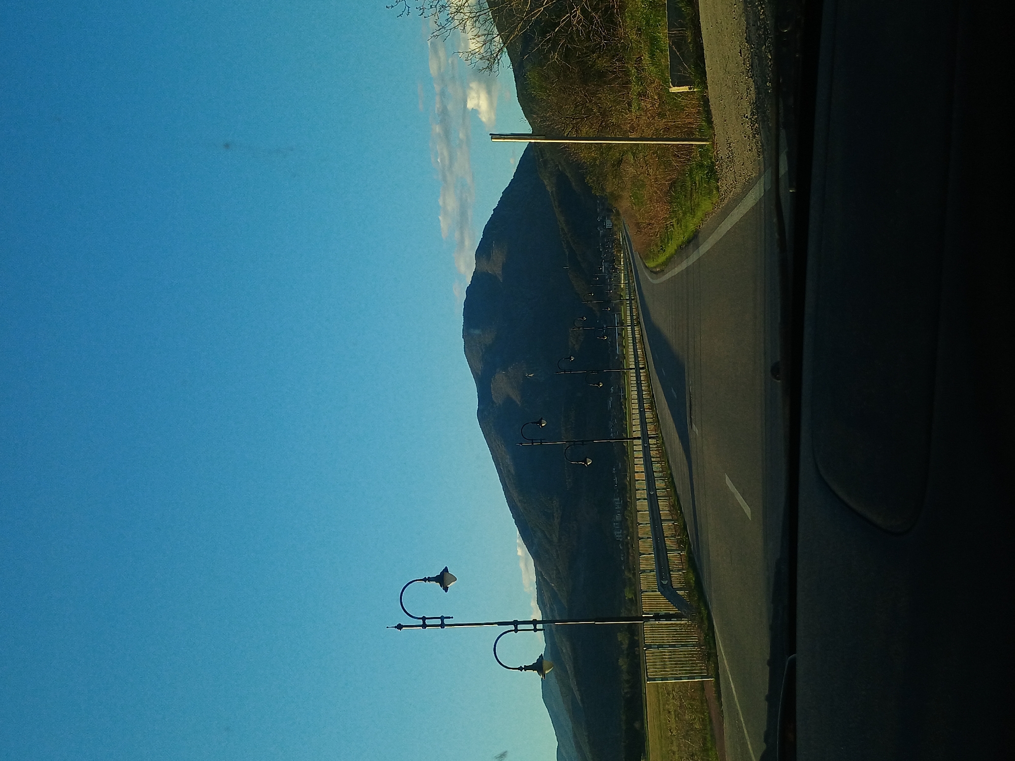 A landscape photographed from inside a vehicle showing a winding road alongside a mountain. The sky is blue with some clouds. A series of old-fashioned street lamps lines the road. The location may be near Maglizh, Bulgaria, based on visual features of the mountain.