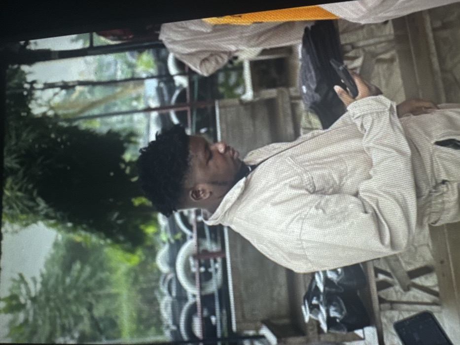 A man with short, dark hair and a light brown jacket lies on his side. He holds a black object, possibly a wallet or phone, in his right hand. The background includes greenery, possibly trees, and a structure with multiple tires. A white cloth or sheet is partially visible above him. The image appears to be taken indoors and rotated.