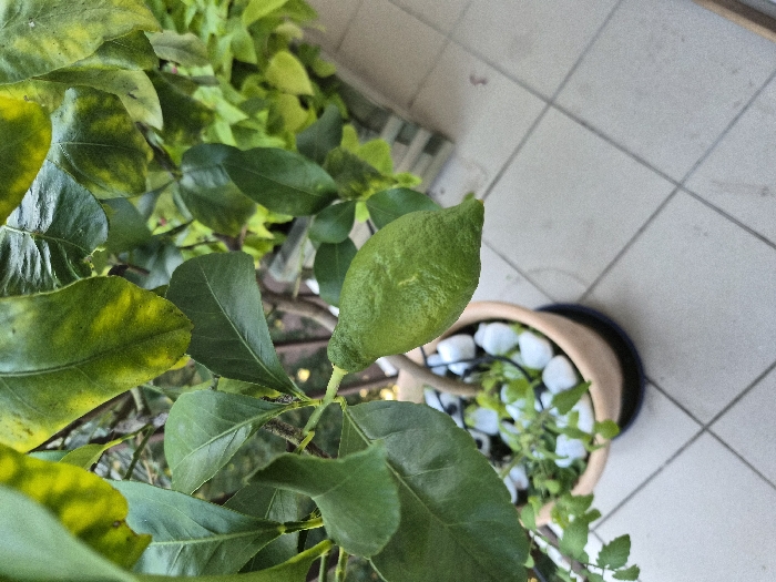This image displays a close-up, eye-level view of a potted citrus plant, likely a lemon tree, situated on a tiled surface on a balcony or patio in Viroflay, France. A single, unripe, light-green, oval-shaped citrus fruit with a textured, slightly bumpy skin hangs prominently in the lower center, attached to a branch. The plant exhibits numerous green leaves of varying sizes, some displaying patches of yellowing or discoloration. The slender trunk is visible near the base. The plant is contained within a terracotta-colored pot, which rests on a black saucer. The soil surface inside the pot is covered with irregularly shaped white decorative stones, with some smaller, vibrant green foliage growing between them. The tiled ground surface is light grey or beige, composed of square or rectangular tiles with visible darker grout lines. In the blurred background, more dense green foliage is visible, suggesting additional plants or trees, along with a faint, light-colored structural element, possibly a railing, on the right side of the frame. No individuals are present, and no specific actions or interactions are depicted.