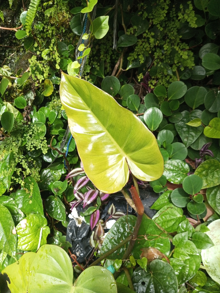 A lush, vibrant display of diverse foliage dominates the frame. A large, heart-shaped leaf gleams in the center, surrounded by smaller, rounded leaves. Ferns add texture with their delicate fronds. Contrasting with the greens are purple and white striped leaves. A dark, possibly plastic, element is nestled amongst the plants near the center. The overall impression is one of a thriving, natural ecosystem.