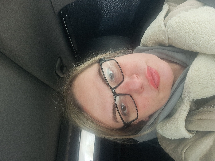 A woman wearing glasses, a gray hoodie, and a tan jacket with a white fleece collar takes a selfie in what appears to be a car. The car's interior is visible in the background, including a seat and part of the ceiling. The woman has fair skin, light brown hair, and is wearing red lipstick. Her expression is somewhat serious. The photo is slightly rotated, giving a tilted perspective.