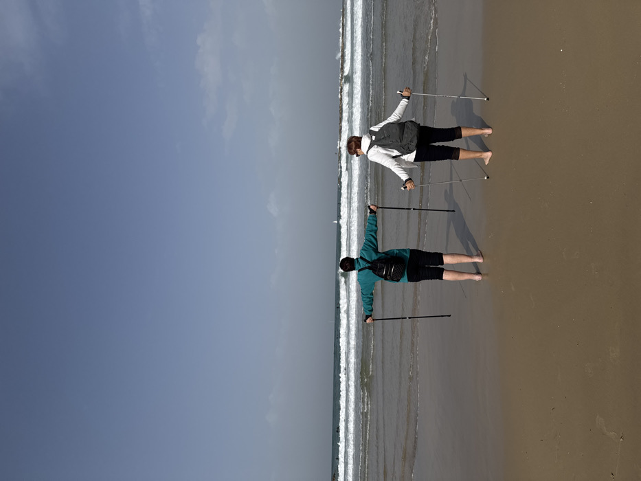 Two individuals are observed from behind, standing barefoot on the wet sand of a beach in Tel Aviv, Israel, facing the Mediterranean Sea. The person on the left, wearing a teal long-sleeved top, dark capri-length pants, and a black backpack, holds two black hiking poles horizontally, extending their arms outwards. The person on the right, dressed in a white long-sleeved top, dark capri-length pants, and a grey backpack, with sunglasses perched on their head, similarly holds two grey and black hiking poles horizontally with arms extended. The Mediterranean Sea features moderate waves breaking on the shore. In the mid-distance to the right, a low rock breakwater is visible. A small sailboat and multiple surfers are discernible further out in the water. The sky is light blue with sparse, wispy white clouds. Shadows of the individuals are cast to their left.
