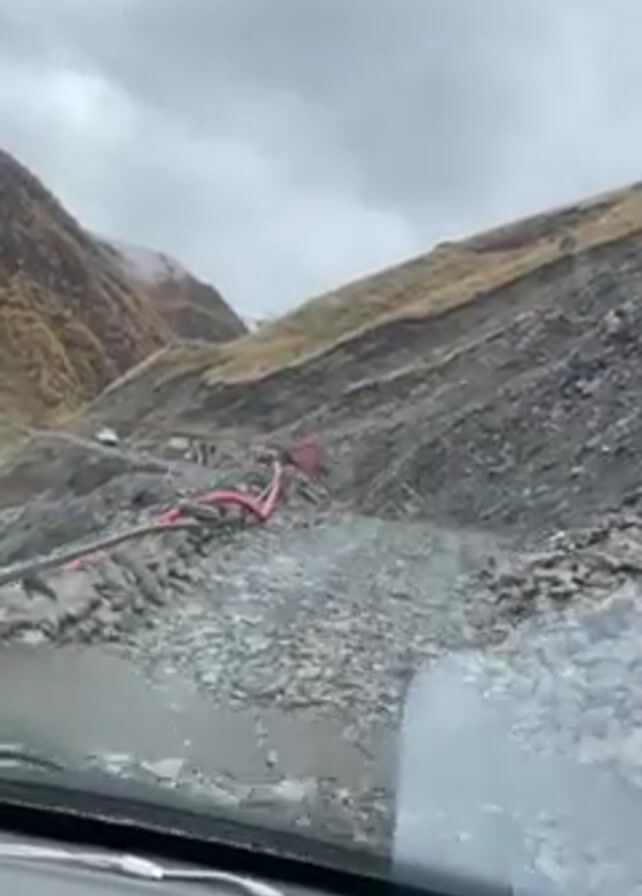 The view from inside a vehicle shows a rocky, mountainous environment on an overcast day. The ground is covered in loose rocks and gravel, with some water visible on the surface. Red industrial hoses are laying on the ground. The terrain is steep and uneven. A small white vehicle can be seen farther up the road. The windshield shows water droplets on the surface obscuring the image.