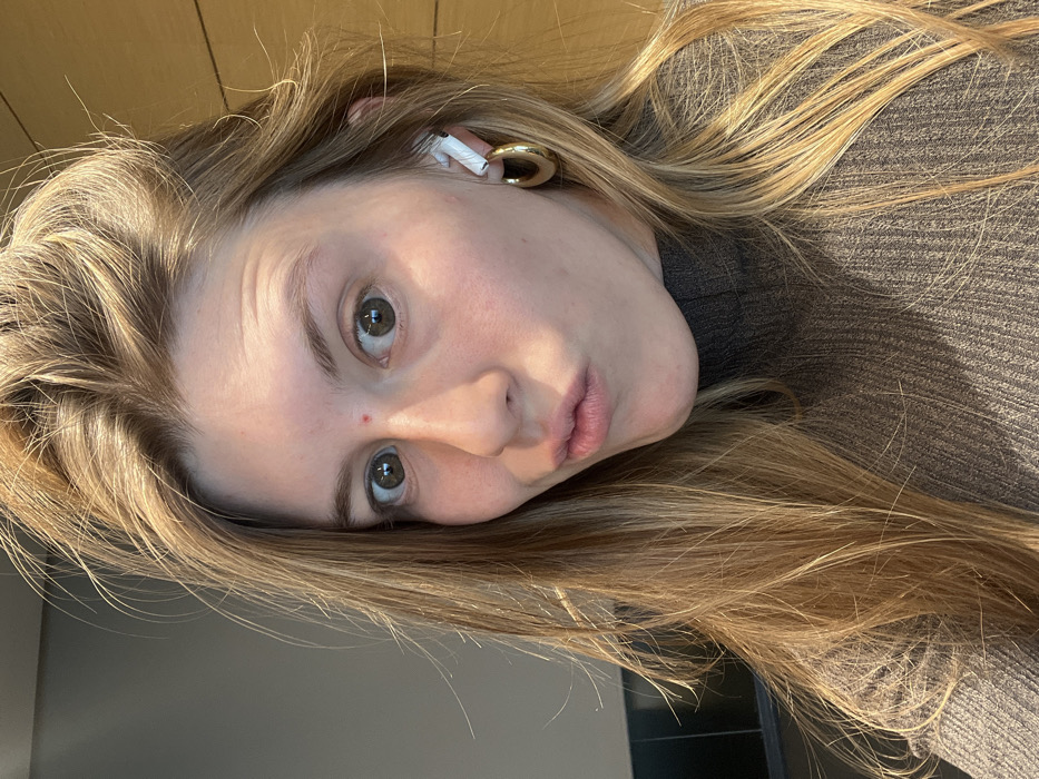 A fair-skinned woman with light brown hair poses, her head tilted to the side, against a tan background