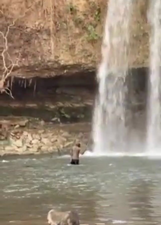 person fishing in a pool beneath a waterfall