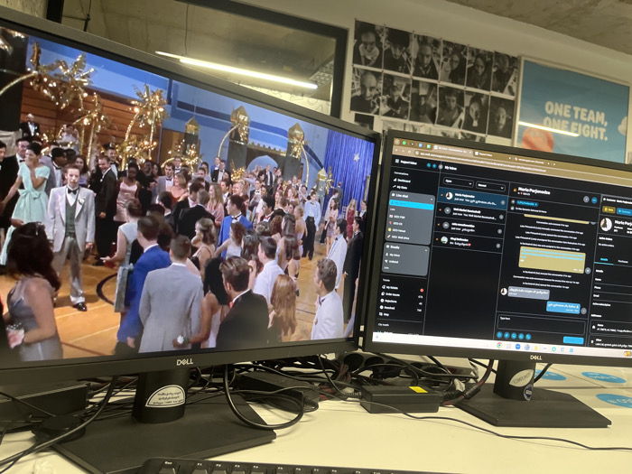 The image displays a workstation within an office setting in Tbilisi, Georgia. Two black Dell computer monitors occupy the foreground on a light-colored desk. The left monitor shows a video of a formal event, likely a high school prom, depicting numerous individuals, predominantly young adults in suits and dresses, gathered in a decorated gymnasium. The right monitor displays a dark-themed user interface, indicative of an email client or communication platform, featuring an inbox with messages in English and Georgian, including conversations with "Mariam Parjanadze" and "Shagi Koberidze." A white sticker with Georgian text, "მოითხოვეთ ქართული სერვისი" (Request Georgian Service), is affixed to the stand of the left monitor. The background features a concrete wall and a white wall. The white wall holds a grid of black and white portraits and a blue poster with the text "ONE TEAM, ONE FIGHT." The ceiling is exposed concrete with visible utilities and a fluorescent light fixture. Numerous black cables are visible beneath the monitors.