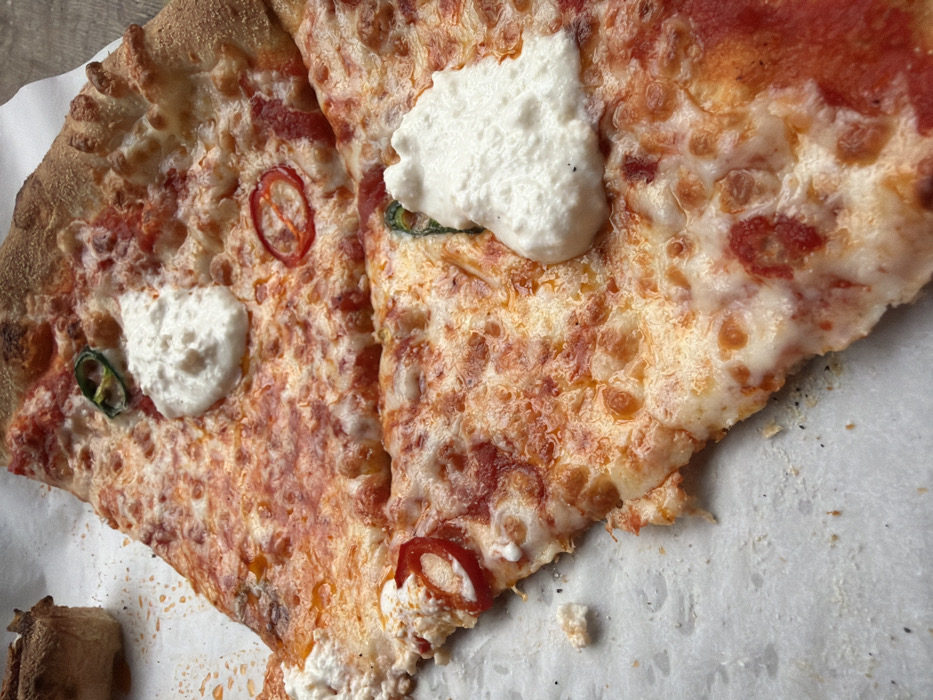This image, captured in Yerevan, Armenia, depicts a close-up view of two overlapping slices of pizza resting on white parchment paper. The top slice, positioned diagonally, features a golden-brown crust, a melted layer of bubbly mozzarella cheese, and visible red tomato sauce. It is topped with two distinct dollops of white ricotta cheese, one green jalapeño ring, and one red chili pepper ring. The bottom slice, partially obscured, shows similar characteristics, including a large dollop of ricotta, a green jalapeño ring, and a red chili pepper ring. A small, dark-crusted bread item or crust fragment is visible out of focus in the upper left background. The parchment paper beneath the pizza displays scattered black specks, possibly pepper or charred remnants, and oily residue. No individuals are present in the scene, and no explicit actions or interactions are occurring beyond the static presentation of the food.