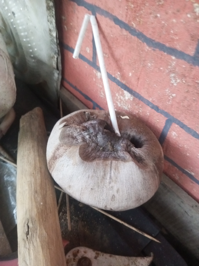 The scene in Balapur, India, depicts a single, mature coconut positioned against a reddish-brown brick wall with dark grey mortar lines. A white plastic drinking straw, bent at an acute angle near its top, is inserted into the coconut's stem end, which exhibits irregular dark brown discoloration and appears to have a puncture point. The coconut itself is light brown with textured, fibrous husk remnants. To the left of the coconut, a light-colored wooden plank or stick lies horizontally. Further left and behind the plank, a translucent, possibly plastic, sheet or material is visible. The foreground and area beneath the coconut are dark, containing scattered debris and a partially visible rusty metal object. No people, active interactions, or discernible actions are present.