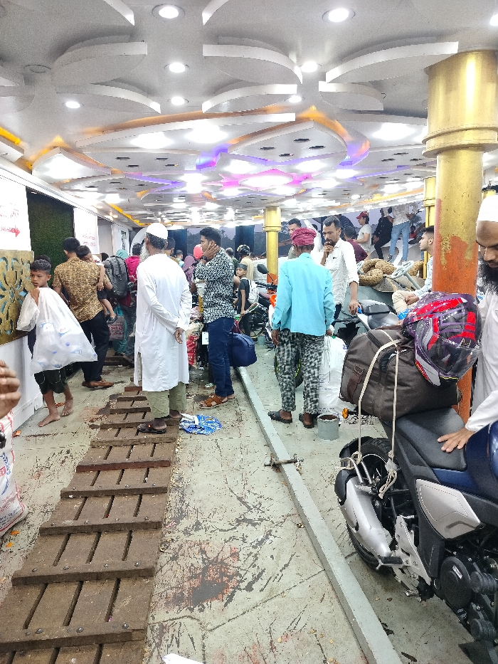 The image depicts a scene in a brightly lit indoor space with a white tiled floor, wooden slatted walkway and a white ceiling with decorative light fixtures. There are at least 20 people present, mostly men, dressed in traditional South Asian clothing. They are standing, talking, and moving around the area. Some are carrying bags and some are interacting with each other. There is a large motorcycle parked on the right side of the image, with a brown duffel bag and a helmet strapped to it. The space is located in a building with a large, gold-colored column, likely a mosque or religious complex, in the city of Dhakha, Bangladesh. The coordinates provided place the location in the city of Dhakha, Bangladesh.