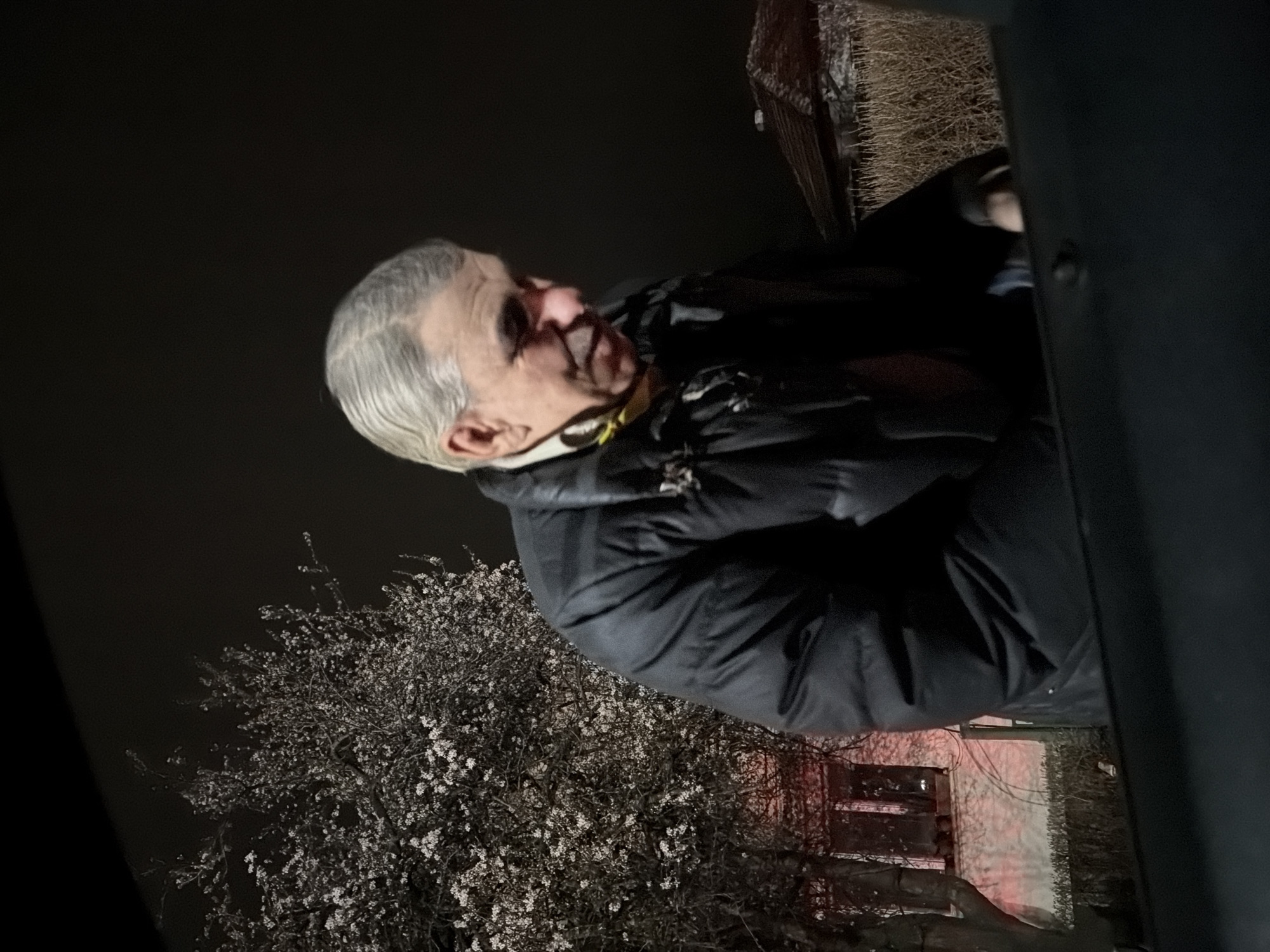 A person is wearing a light grey wig and a dark jacket. The background includes a blooming tree, a lit-up building, and a dark sky. The location appears to be Dragichevo, Bulgaria, based on visual elements and available geographical data.