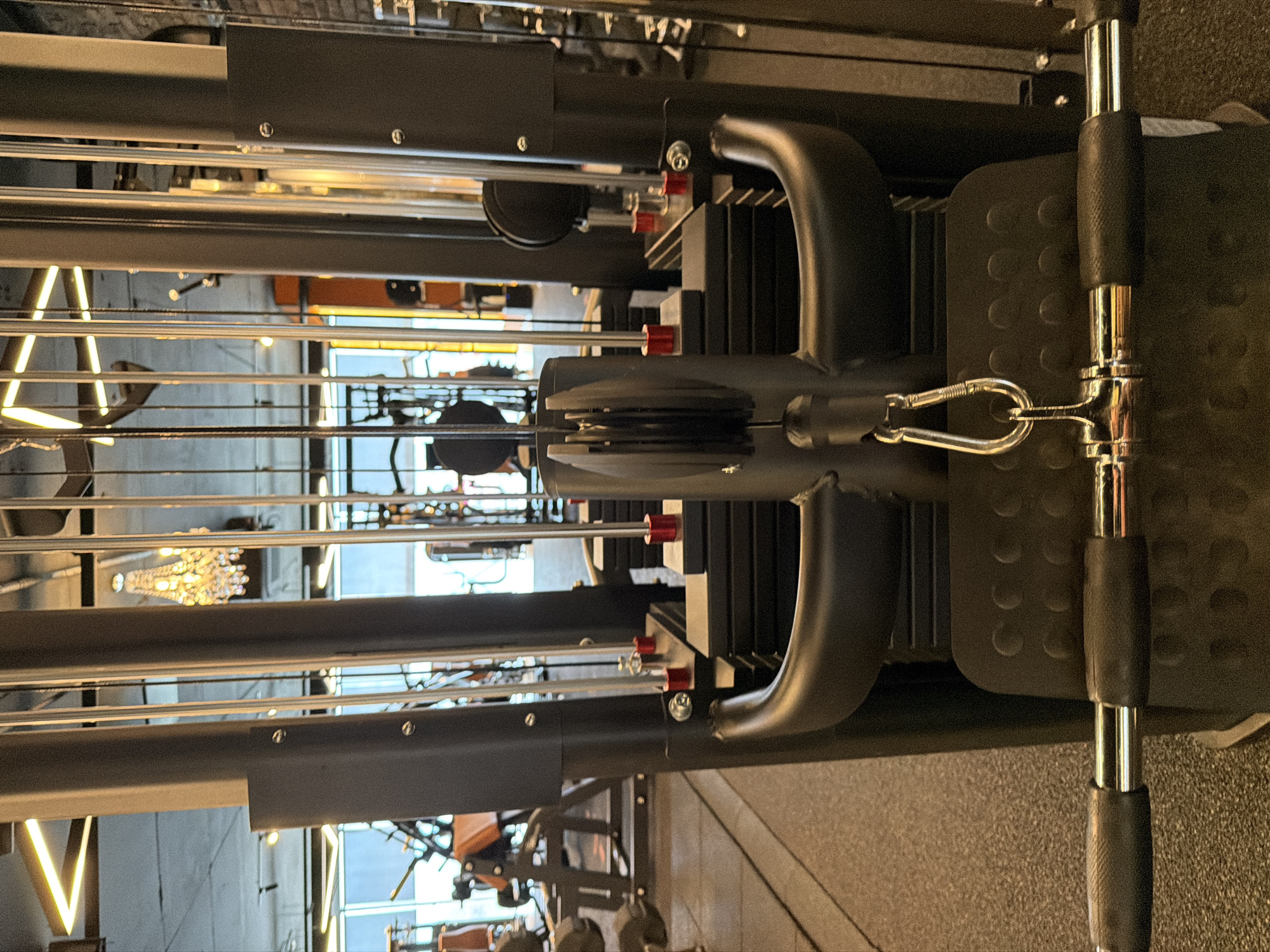 This image shows a close-up of a weight machine, likely located in a gym, with a focus on the weight stack and the attachment mechanism