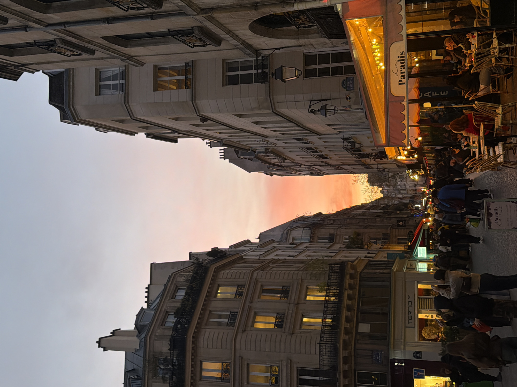 The image depicts a bustling street scene on Rue Saint-Martin in Paris, France, during dusk or early evening. A vivid orange-red sunset glows intensely at the end of the street, contrasting with the lighter blue-grey sky above. Multi-story Haussmannian-style buildings with light-colored stone facades line both sides of the narrow, cobblestone street. On the left, a large building features multiple windows, many illuminated from within, and several wrought-iron balconies. Its ground floor houses a brightly lit shop labeled "TERTIO." On the right, another building prominently features "Le Paradis" cafe on its ground level. The cafe is characterized by an orange awning strung with warm lights, extending over an outdoor seating area. Numerous patrons are seated at small tables with wicker chairs on the sidewalk, engaged in dining and conversation. A classic black street lamp is affixed to the building's facade, beneath which a blue street sign clearly identifies "RUE S. MARTIN." The street itself is densely populated with pedestrians walking in both directions. People are seen individually and in groups, some engaged in conversation, others observing their surroundings. An A-frame sign for "Paradis" is visible on the sidewalk in front of the cafe. Two individuals near the "TERTIO" shop appear to be holding up devices, possibly capturing images or videos. Artificial lighting from shops, cafes, and street lamps illuminates the lower parts of the scene, while the upper portions of the buildings are silhouetted against the colorful sky.