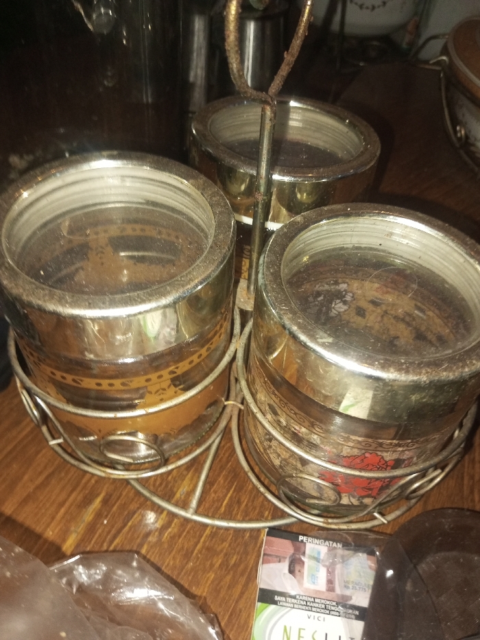 Three metallic containers, held in a metal wire frame with a vertical rod, sit on a wooden surface. The containers are cylindrical with clear lids and are likely meant for spices. They are dusty and have residue inside. Next to the containers, there is a pack of cigarettes. A plastic bag lies partially visible in the lower left corner.