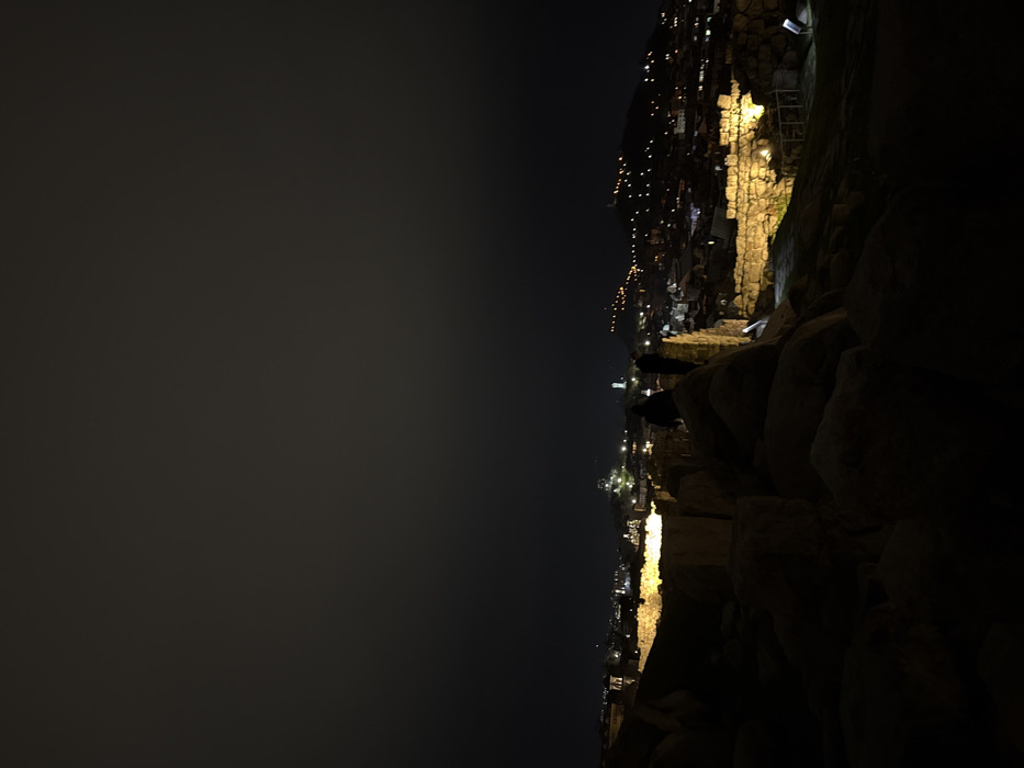 The scene depicts a nighttime panoramic view of Plovdiv, Bulgaria, observed from an elevated position likely within the Old Town district, possibly near Nebet Tepe or Hisarya Fortress ruins. In the immediate foreground, large, dark, irregular rock formations and rough stone blocks are visible, mostly obscured by deep shadows. The midground features ancient-looking stone walls and structures, illuminated by warm yellow artificial light sources, creating distinct areas of brightness against the overall darkness. Two human figures are silhouetted against the city lights, standing or sitting on a higher stone structure. Their forms are indistinct, with one appearing slightly taller and to the left of the other. They are positioned to observe the vista. The background reveals a sprawling urban landscape of Plovdiv under a dark, possibly overcast, sky. Numerous city lights, ranging from clusters to individual points, illuminate buildings and streets, extending into the distance and up various hillsides on the horizon. A prominent, tall, slender white structure, possibly a minaret or bell tower, is dimly visible among the city lights towards the center-left.