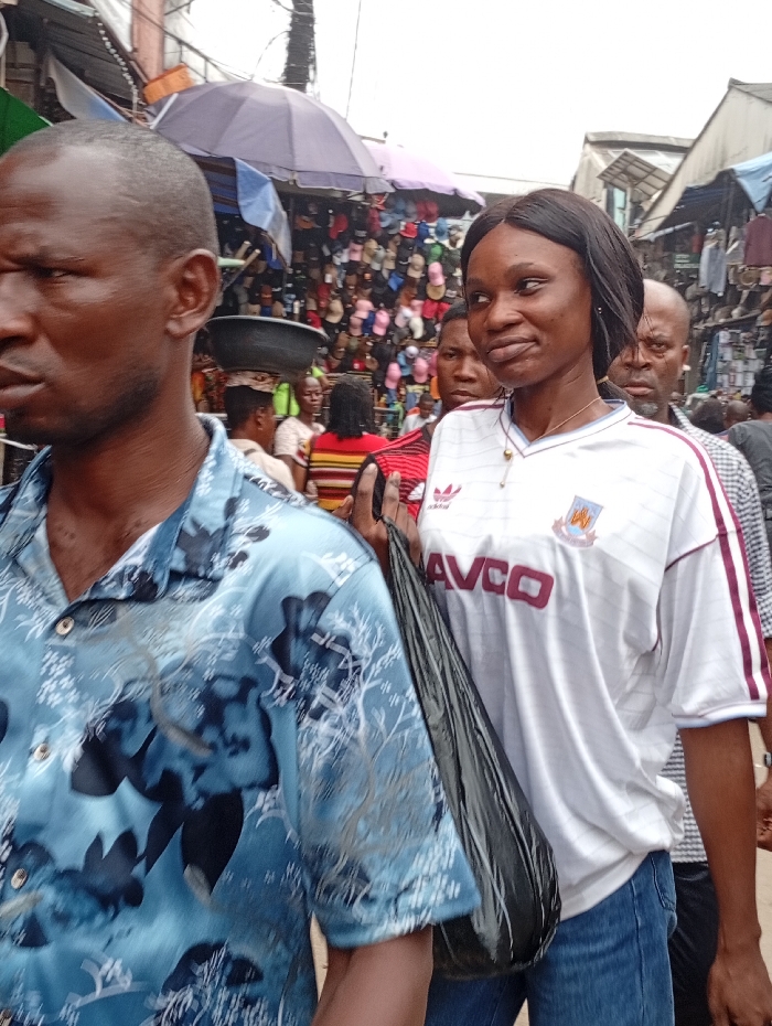 In a bustling outdoor market, a crowd of people is visible. To the left, a man in a patterned blue shirt walks forward. Adjacent to him, a woman wearing a soccer jersey and jeans carries a black plastic bag. Numerous hats and vendors fill the background under colorful umbrellas and awnings. Other individuals stand between the two main figures, adding to the busy environment.