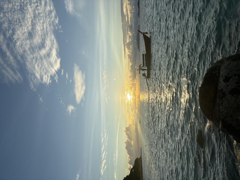 The image depicts a sunset or sunrise over the sea in the city of Ban Ko Li Pe, Thailand. The sun, a bright golden-orange orb, is positioned low on the horizon, partially obscured by cumulus clouds, and casts a prominent, shimmering reflection path across the water towards the viewer. The sky above is light blue, featuring scattered white cirrus and cumulus clouds. In the mid-ground, a traditional Thai longtail boat is stationary on the water, positioned to the right of the sun's reflection. The boat has a dark hull, a lighter-colored canopy structure, and a long pole extending from its stern, indicating an outboard engine. Two human figures are visible as silhouettes on the boat: one standing near the stern, and another further forward under the canopy. To the far left, a dark, vegetated island or headland extends into the water, with a small, light-colored structure visible near its base. Distant, hazy landmasses are discernible on the horizon to the far right. In the immediate foreground, a large, dark-colored rock is partially submerged in the rippling, dark blue-green water, which exhibits moderate surface chop.