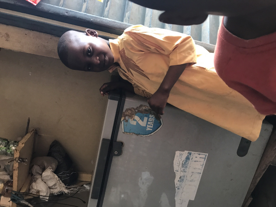 In the city of Ijoko, Nigeria, a young male child is positioned to the left of center, standing beside a grey chest freezer