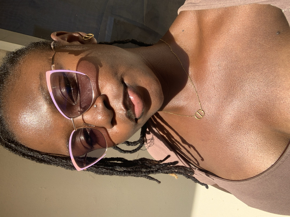 A close-up, chest-up portrait depicts a dark-skinned female individual located outdoors in Tempure, Nigeria, under direct sunlight. She is wearing light pink, cat-eye style sunglasses with dark lenses and a small silver stud piercing in her left nostril. Her hair is styled in dark dreadlocks, some visible over her left shoulder. A gold-colored, irregular oval earring is present in her right ear. She wears a thin gold-colored chain necklace with a circular pendant bisected by a horizontal line. Her lips are slightly parted and appear glossy. She is dressed in a light brown or tan-colored top, revealing her upper chest and shoulders, with a small dermal piercing visible on her upper sternum. Direct sunlight illuminates the subject from the upper right, creating strong highlights on her forehead, cheekbones, and décolletage, and casting shadows from her hair onto her upper body. The background is a plain, light-colored wall.