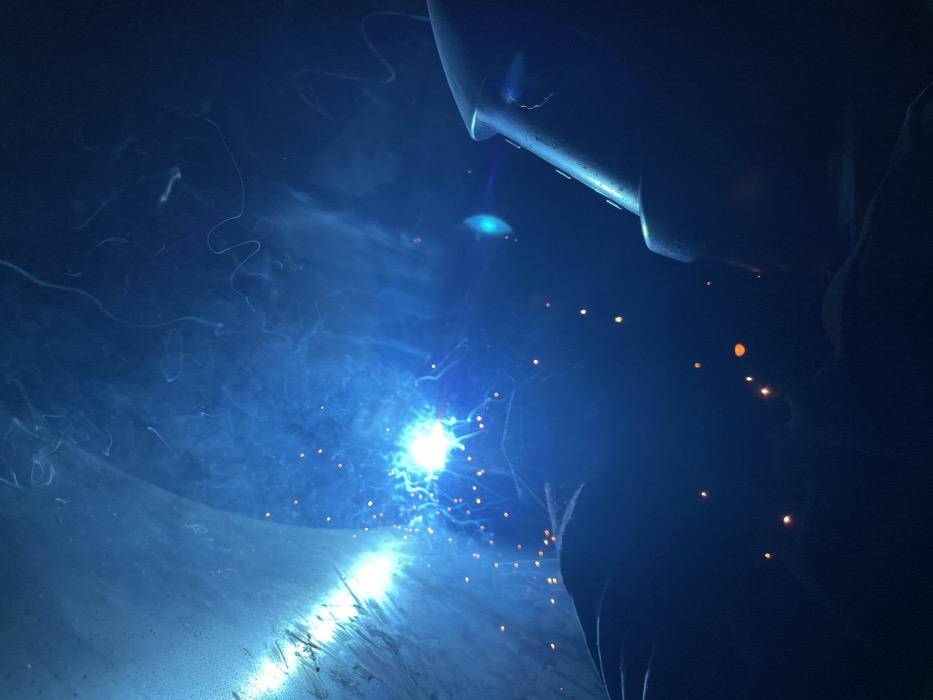 The scene depicts an active welding operation within an interior, dark environment in Zaljevo, Montenegro
