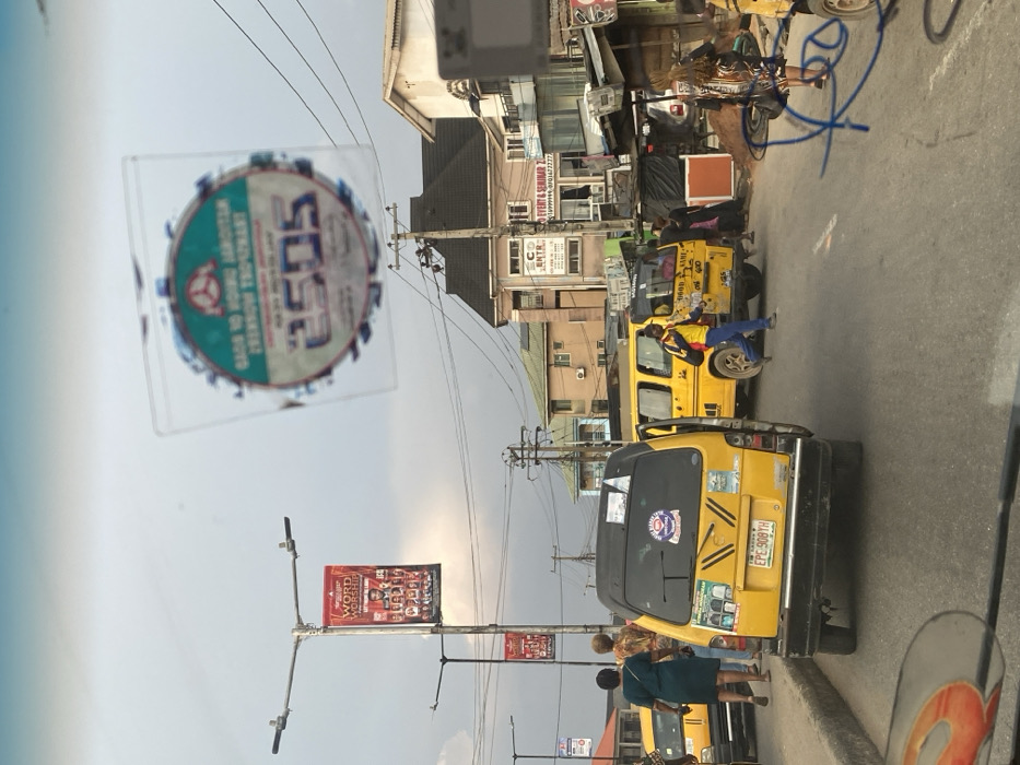 The image presents an overcast daytime street scene in Lagos, Nigeria, viewed from the interior of a vehicle