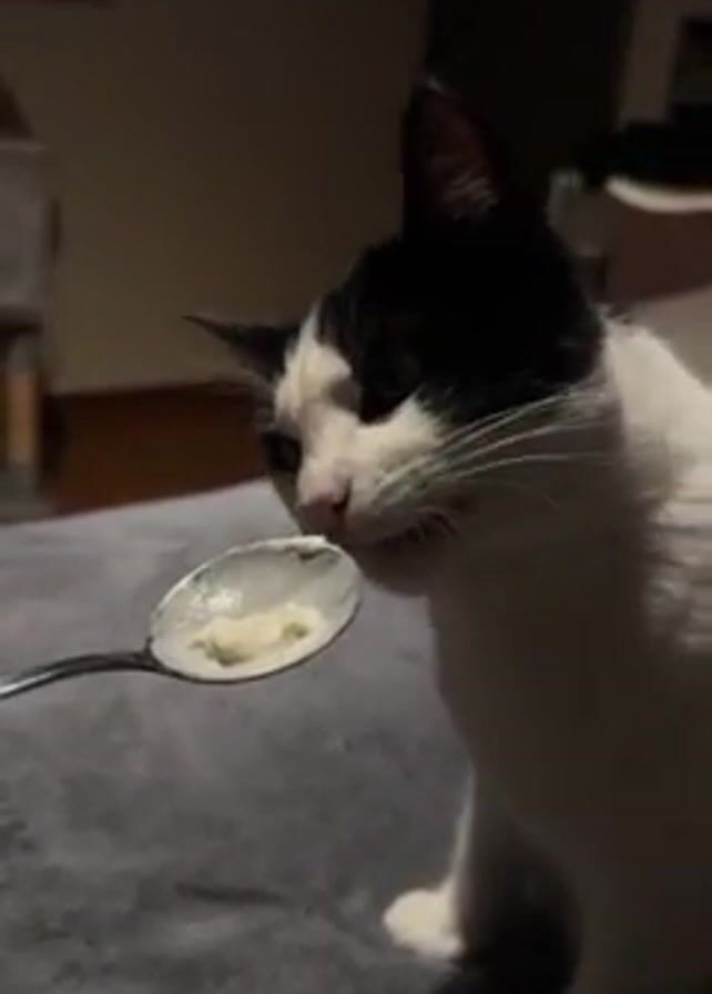 A black and white cat is shown in a close-up shot as it eats something from a spoon