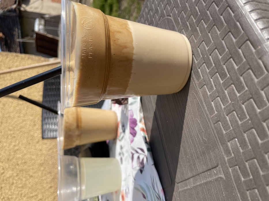 The image displays an outdoor scene in Tarnava, Bulgaria, under bright sunlight, evidenced by prominent shadows. Three cold beverages in clear plastic cups rest on a dark grey plastic outdoor table with a distinct woven texture. A white fabric placemat featuring a floral pattern of purple, pink, and green leaves is visible beneath the cups. In the immediate foreground, the closest cup contains a two-layered beverage: an opaque, light beige liquid at the bottom, surmounted by a thick layer of frothy, darker caramel-colored foam. A black plastic straw is inserted into this drink. The cup bears the embossed text "MADE IN PLASTIC" and a recycling symbol. To the left and slightly behind, a second clear plastic cup holds a translucent, pale yellow liquid. Further back, a third partially visible clear plastic cup contains a beverage resembling the foreground drink, characterized by a frothy, caramel-colored top layer. A second black plastic straw extends vertically from behind this cup. The background features a textured wall, possibly stucco, in a light brown or tan hue. Beyond this wall, portions of a residential structure with a reddish roof and green ground are faintly visible, indicating a rural or suburban environment. No individuals are present in the frame.