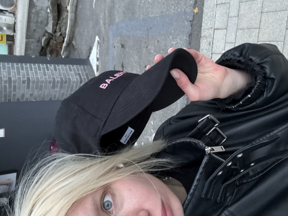 A blonde woman with blue eyes wearing a black leather jacket and a black Balenciaga baseball cap. She is holding the brim of the cap with her right hand. The street and some buildings are visible in the background.