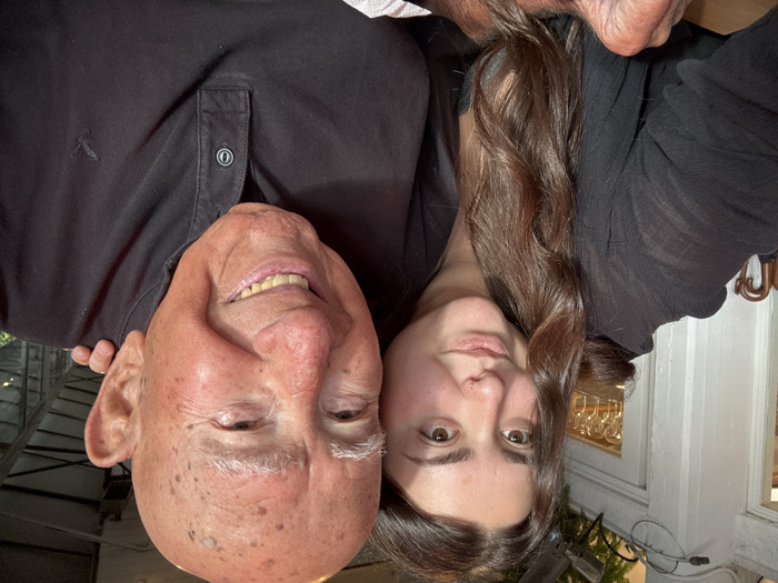 A close-up, selfie-style photograph depicts two individuals, an elderly bald man and a younger woman, smiling directly at the camera