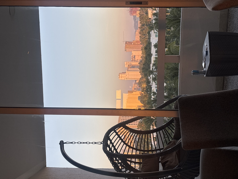 The scene is an elevated view from a private balcony or patio in Acapulco de Juárez, Mexico, observed at either sunrise or sunset, looking over an urban landscape. In the foreground, on the left, a dark brown, synthetic-wicker hanging egg chair with a light brown fabric cushion is suspended from a curved metal stand. To the right, the upper back of a dark grey upholstered chair is partially visible. Further right, a dark brown, square-top, synthetic-wicker side table is positioned on a light-colored, textured floor. On the table, a silver-colored beverage can with red and blue branding is present, alongside a set of keys. A light-colored concrete balcony railing spans horizontally across the lower mid-ground. The expansive view is framed by the vertical mullions of a glass sliding door system. Beyond the railing, a dense expanse of vibrant green foliage, primarily palm trees, covers the immediate mid-distance, punctuated by several white, low-rise, flat-roofed buildings. In the background, a cluster of multi-story buildings and high-rise towers are visible, with their facades illuminated by the warm, low-angle sunlight, exhibiting orange and pink tones. At least two of the taller structures feature visible construction cranes on their upper sections. The sky above is clear, displaying a gradient from a pale blue at the zenith to soft orange and pink hues near the horizon line. No individuals are present in the image.