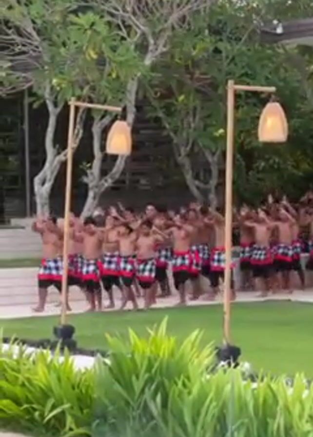 A video shows a group of men performing a traditional Balinese dance