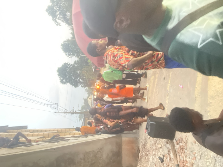 A street scene depicts a gathering of people. Individuals stand in a line, some are sitting on a low structure. Clothing varies; some wear bright colors like orange and green. A red inflatable structure is visible overhead. Power lines crisscross the sky. The focus is partially obscured by a few close-up faces. A speaker is on the ground near the crowd.
