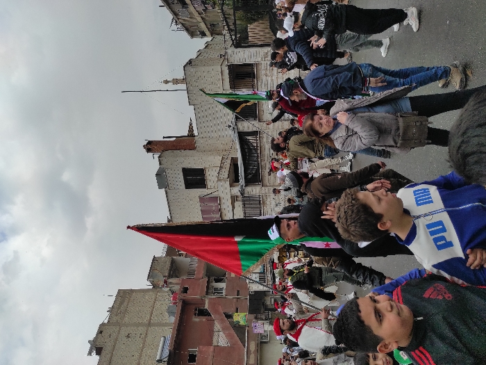 The image displays a crowded street scene in Ash-Shaghour Municipality, Syria, under an overcast sky